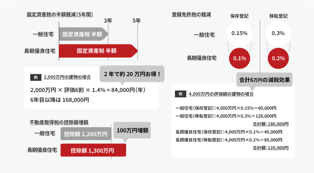 固定資産税の半額軽減(5年間)、不動産取得税の控除額増額、登録免許税の軽減といった税制優遇を受けられます。これにより、購入から維持までのコストが抑えられ、経済的にメリットのある選択です。
