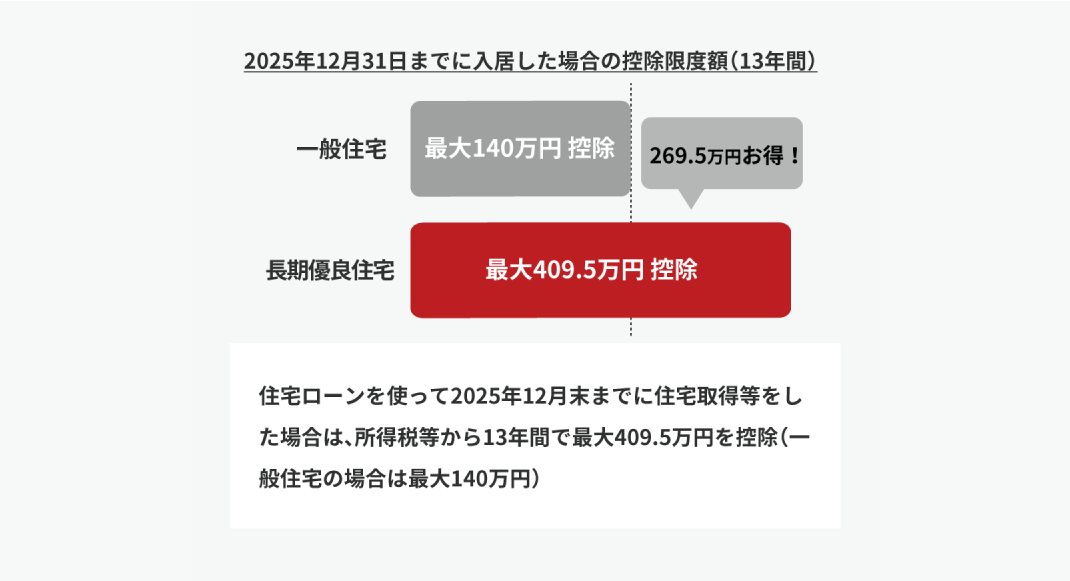 住宅ローン控除では、年末時点のローン残高の0.7%(上限5,000万円)を最大13年間、所得税から控除可能です。一般住宅では控除対象残高の限度が3,000万円ですが、長期優良住宅では、2024年以降は4,500万円となり、最大控除額も35万円に増額されます(一般住宅は21万円)。